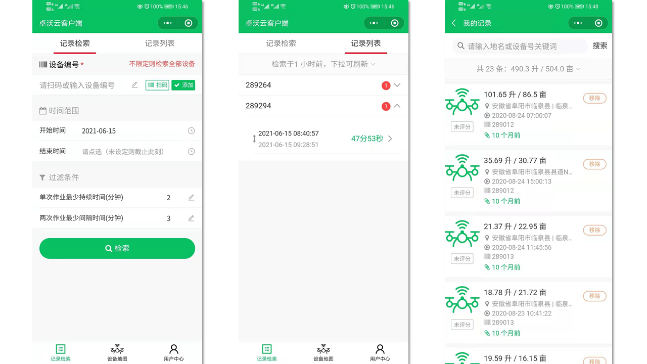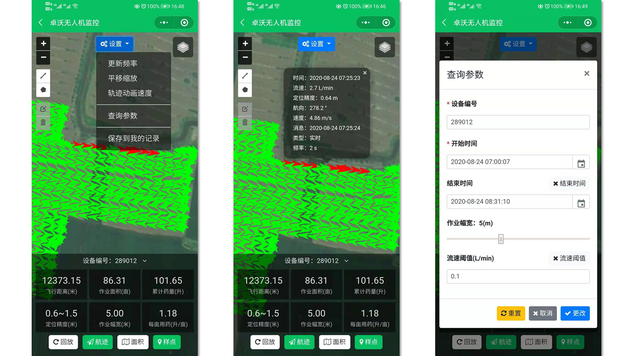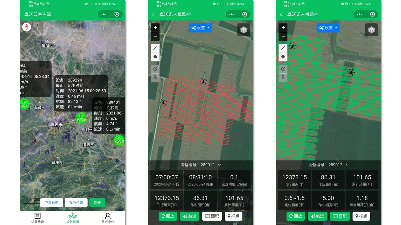 植保无人机终端物联网设备监控作业飞行轨迹、农药喷洒流速,移动客户端实时查看实况数据、跟踪作业情况。支持作业面积、药量使用情况统计分析,同时支持历史记录查询、记录保存、用户分组等操作。