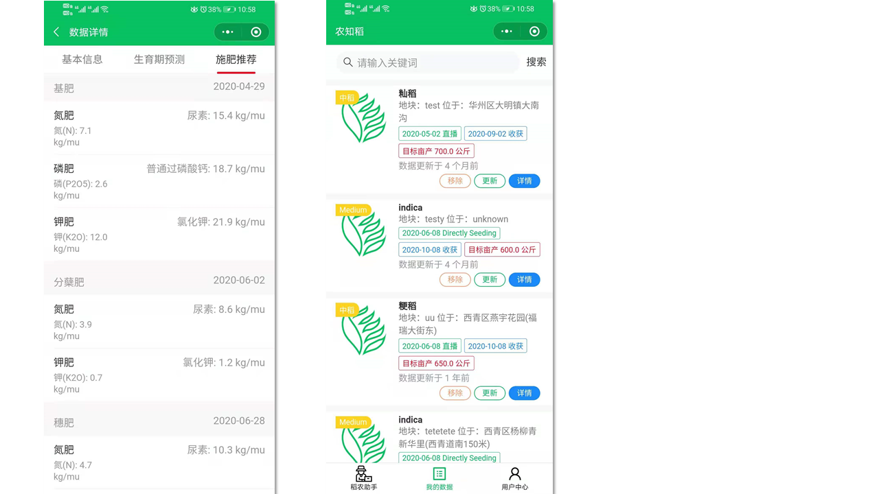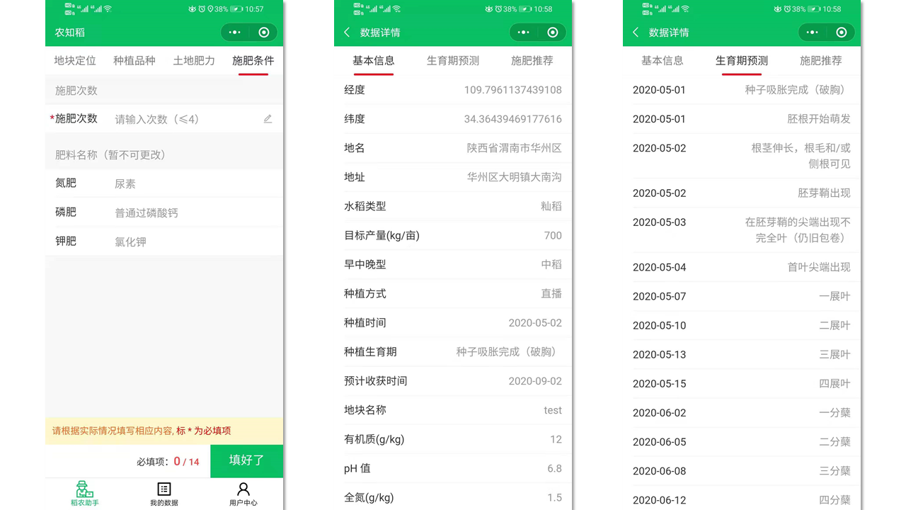 根据用户给定的地块定位、种植品种、土壤肥力和施肥条件等信息,对生育期进行预测,并推荐施肥的时间、肥料种类和施肥量。