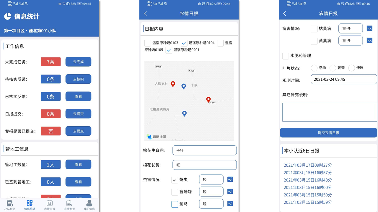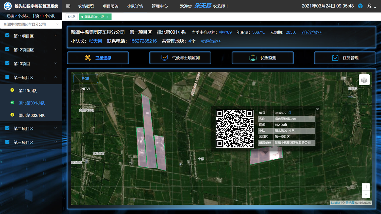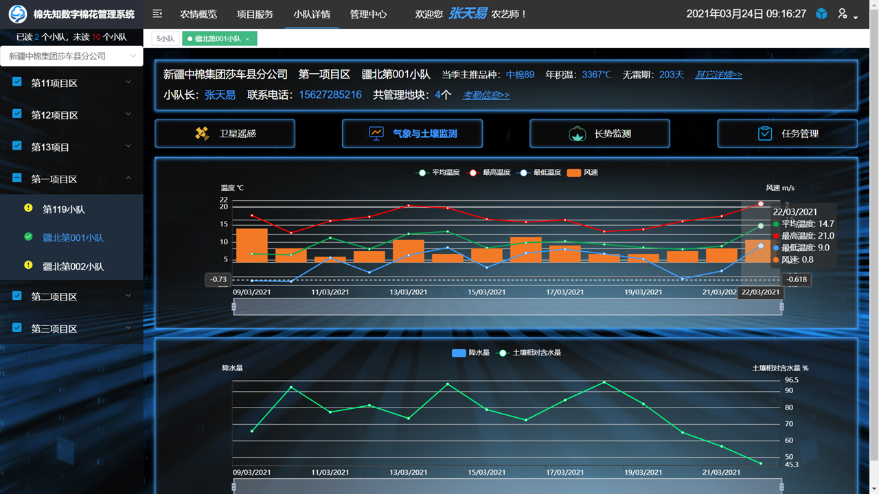 【棉先知】专业版是面向植棉合作社、托管企业、种植大户等规模化种植者的数字棉花生产管理系统。该系统在农艺师/小队长/管地工工作业务体系内,可配备卫星遥感、无人机和田间物联网监测,配备生育期、长势、气象灾害、病虫害等监测预测,以及灌溉、施肥、化控等措施的辅助决策服务支持。