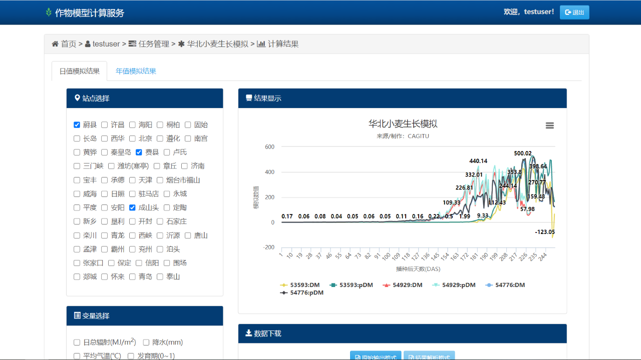 以 ChinaAgrosys 为基础,整合气象、作物、土地等数据资源,同时集成其他开源作物模型,为作物生长发育模拟研究和应用提供计算服务,为用户大量节省数据搜集整理、计算任务脚本编写、模型参数配置和调试、结果可视化对比分析等人力、物力和时间成本。